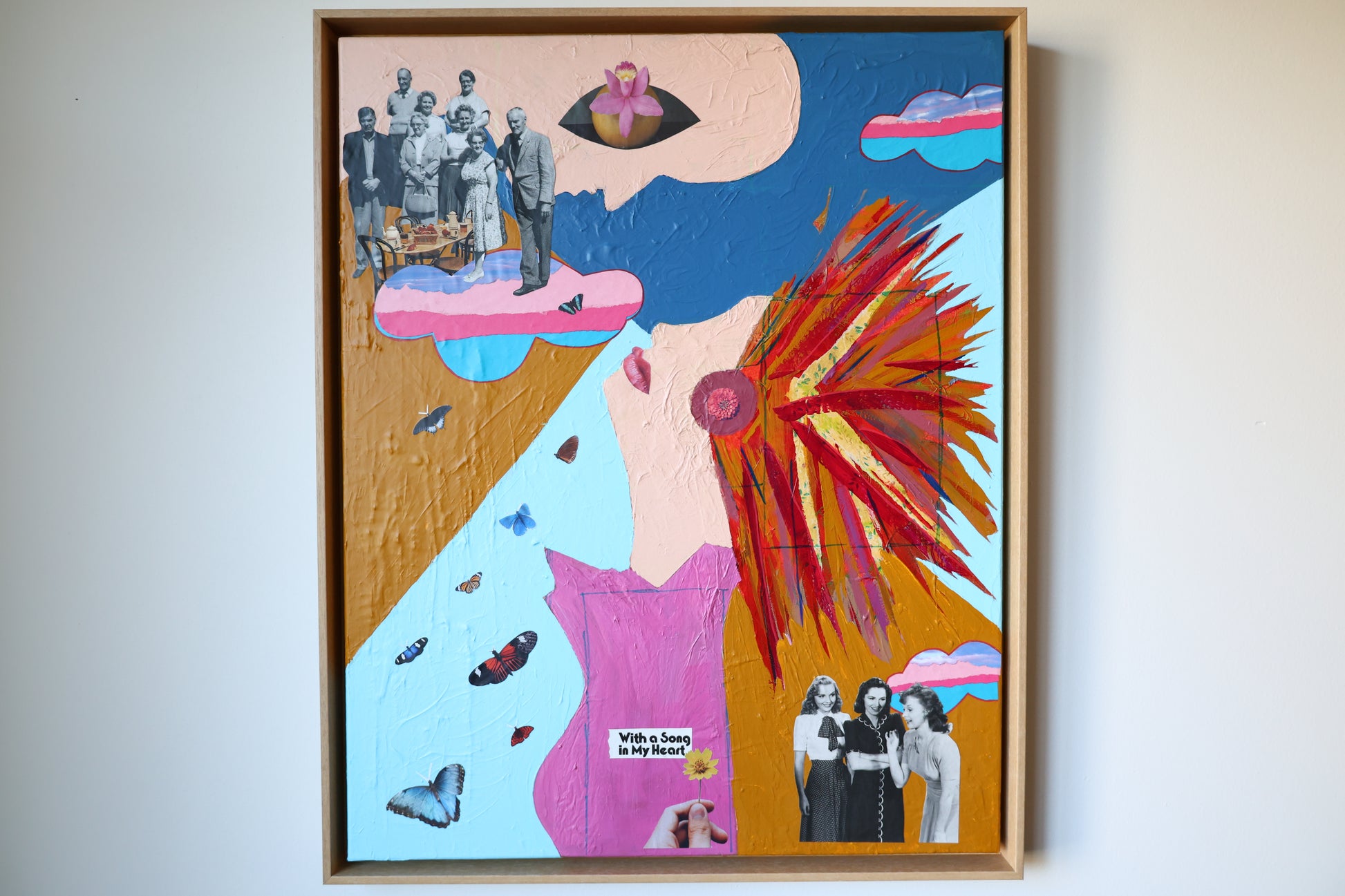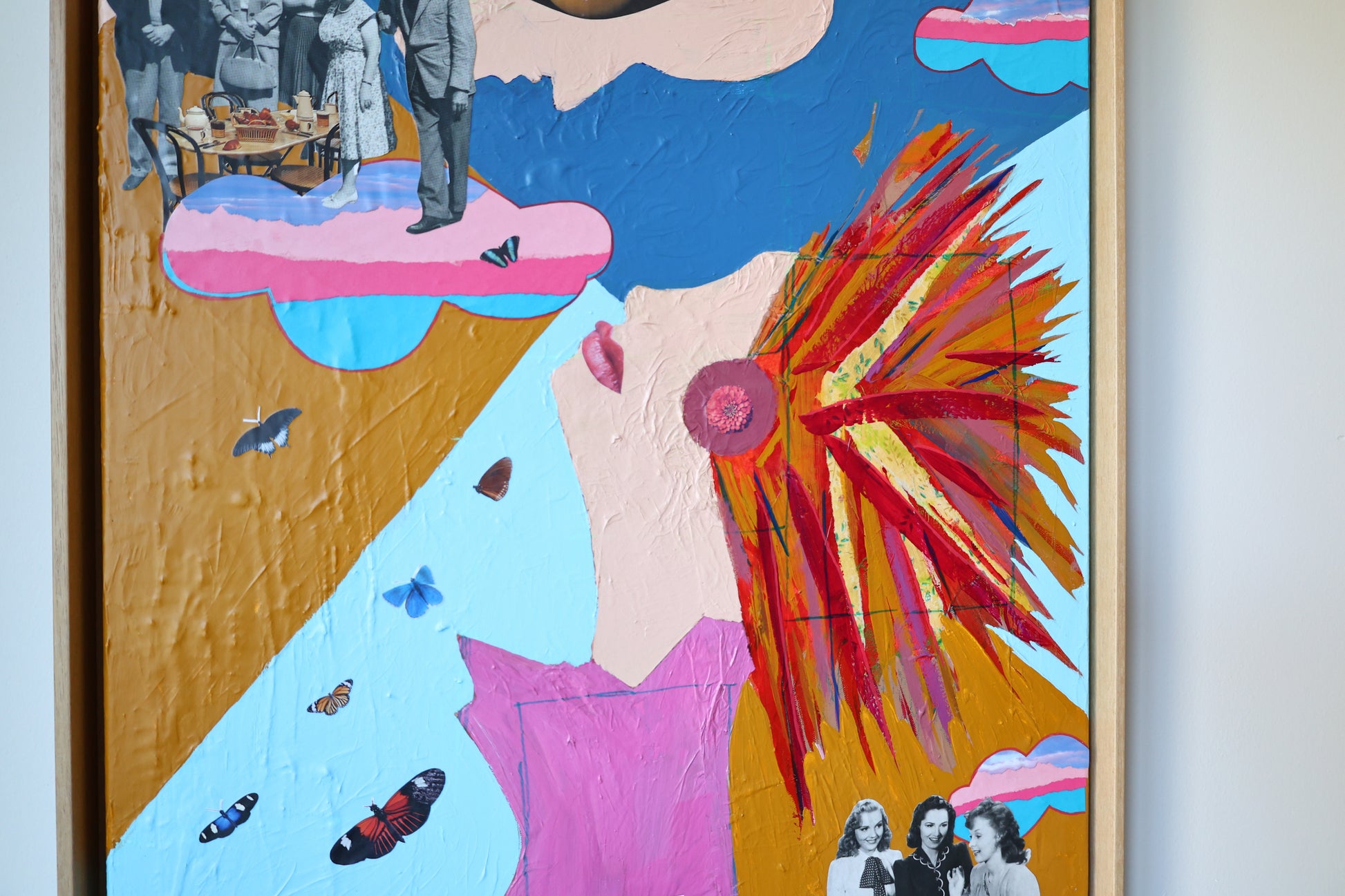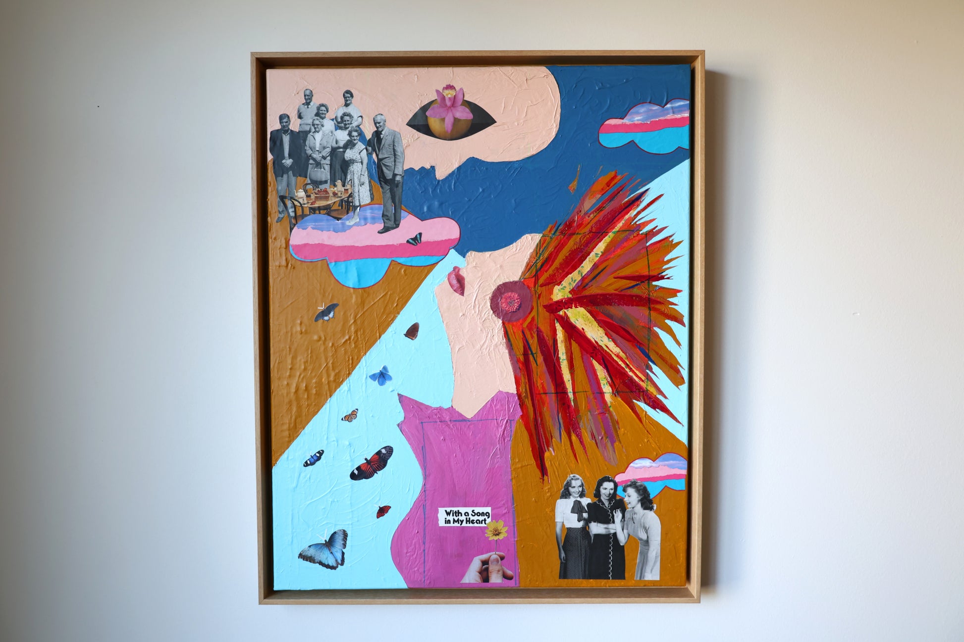 With the theme of clouds carried through this collection, this piece is no different. There is a symbolic God presence at the top and 'us' in pink with a song in our heart. There is an invitation to come to His table, bringing transformation to our life, symbolized by the butterflies. This piece is an encouragement to keep our eyes on Him who gives and sustains life while turning from the ways of the world.