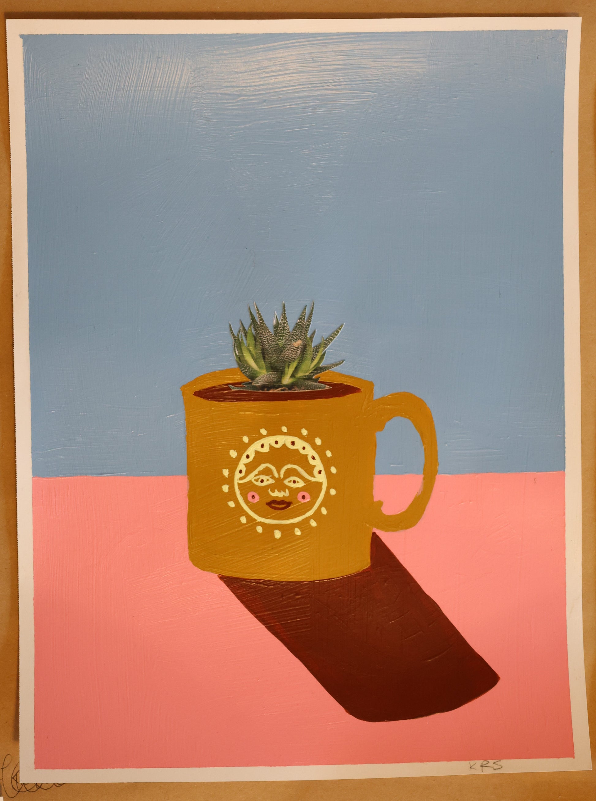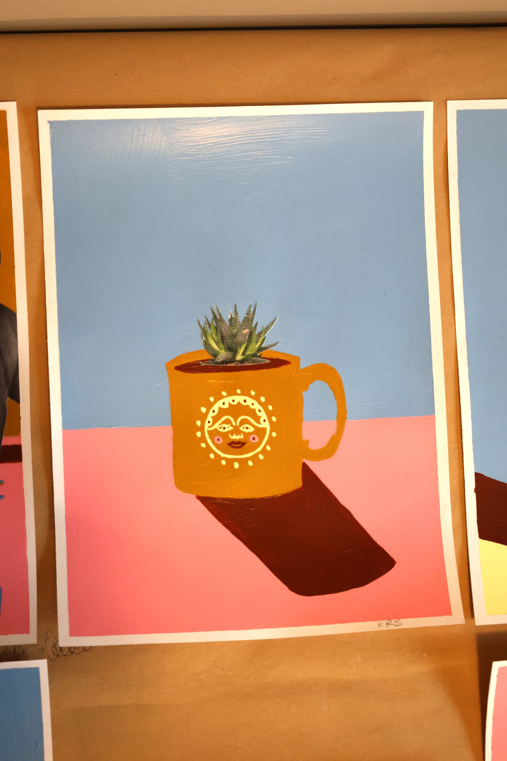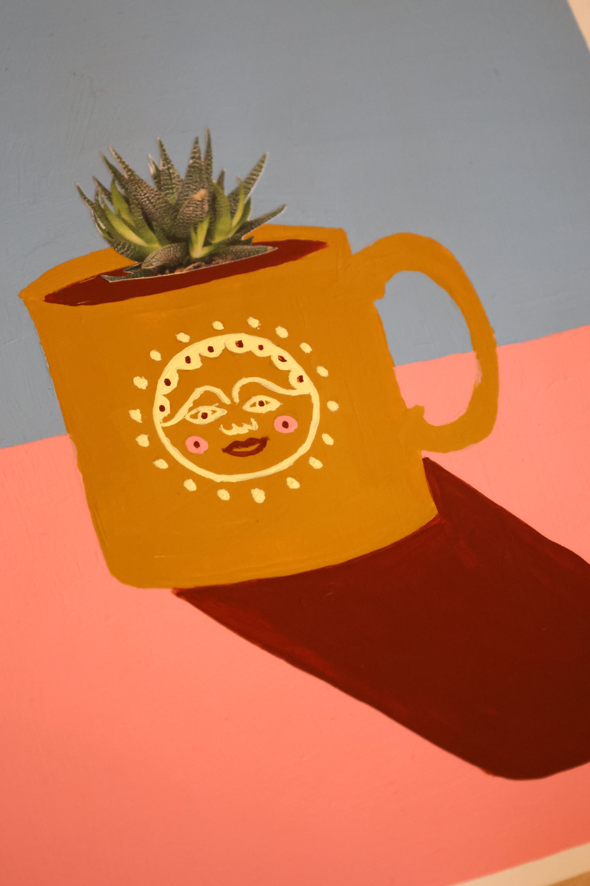 A little zebra haworthia thriving faithfully in the ocher mug that radiates sunshine.