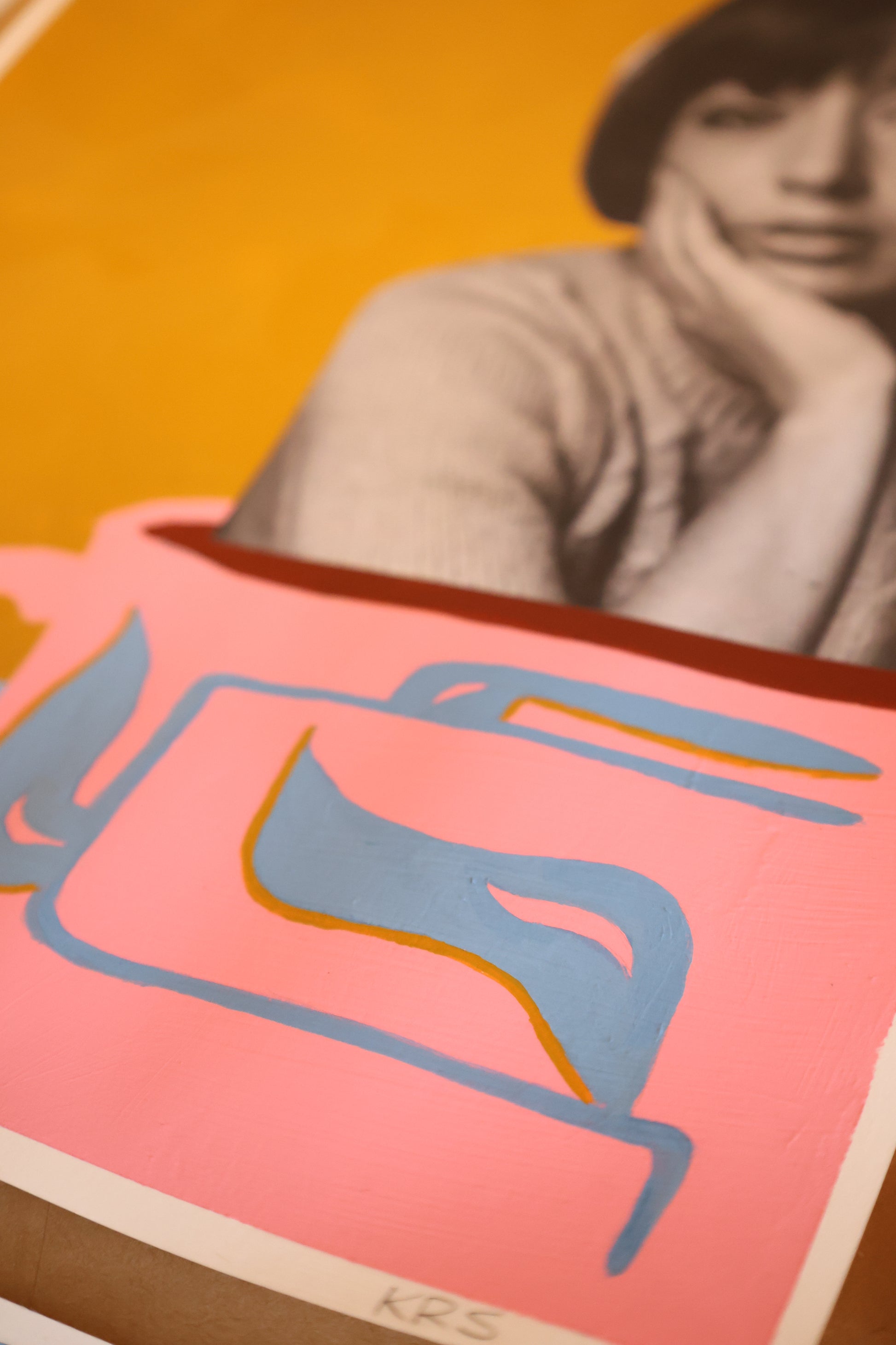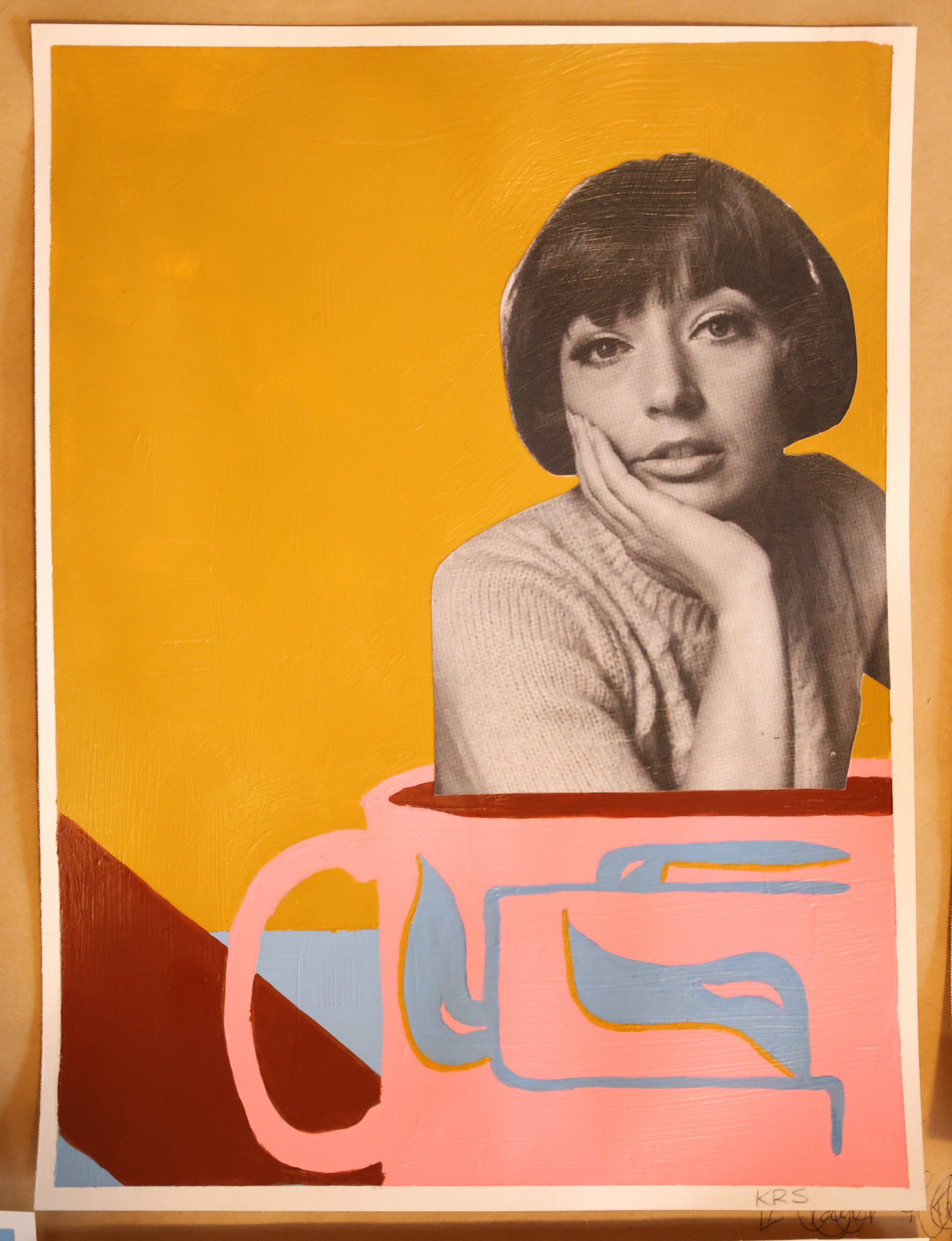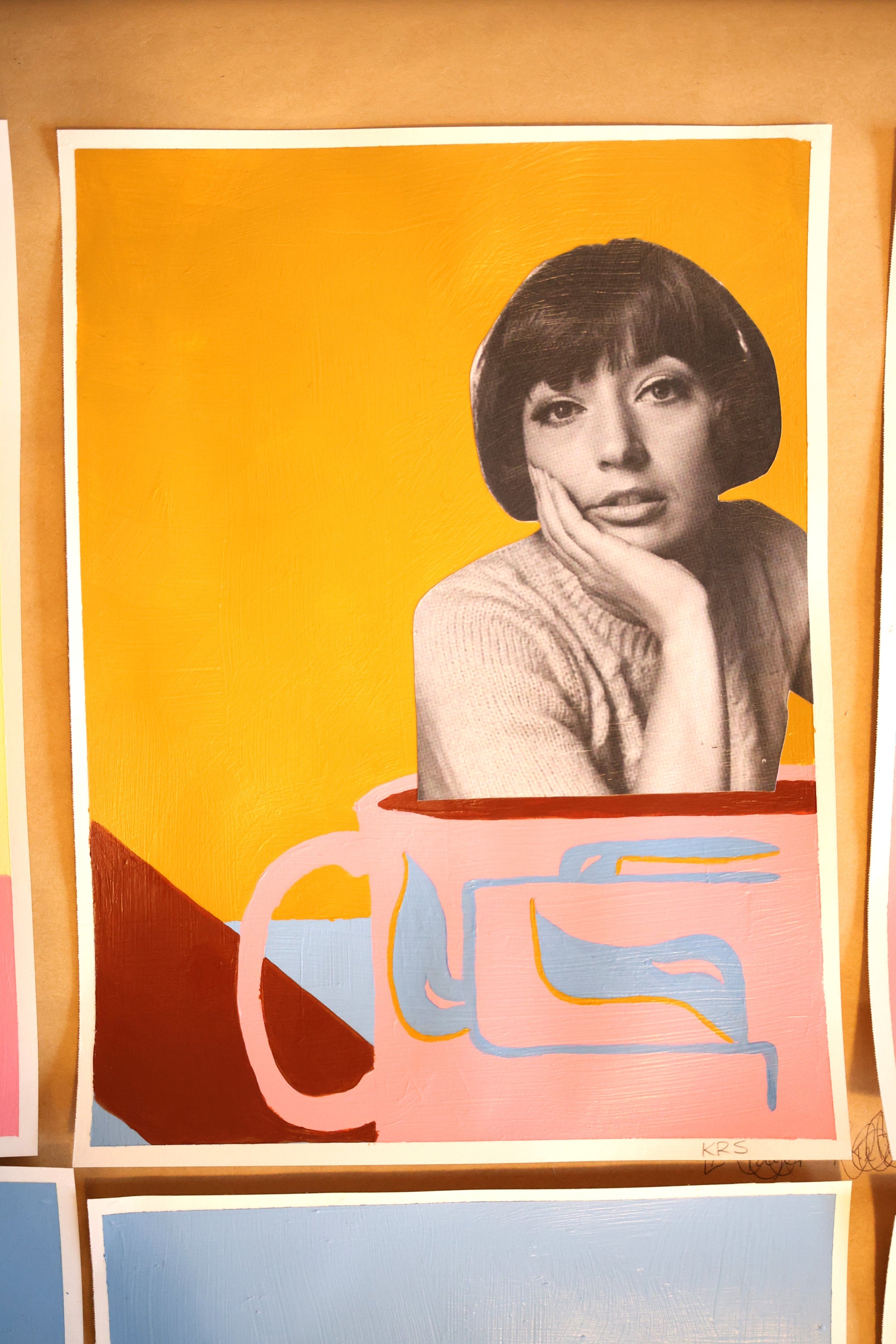 A soft blue vine creeping up a pink mug with collaged women holding her face in consideration. Ocher background gives this piece much warmth.