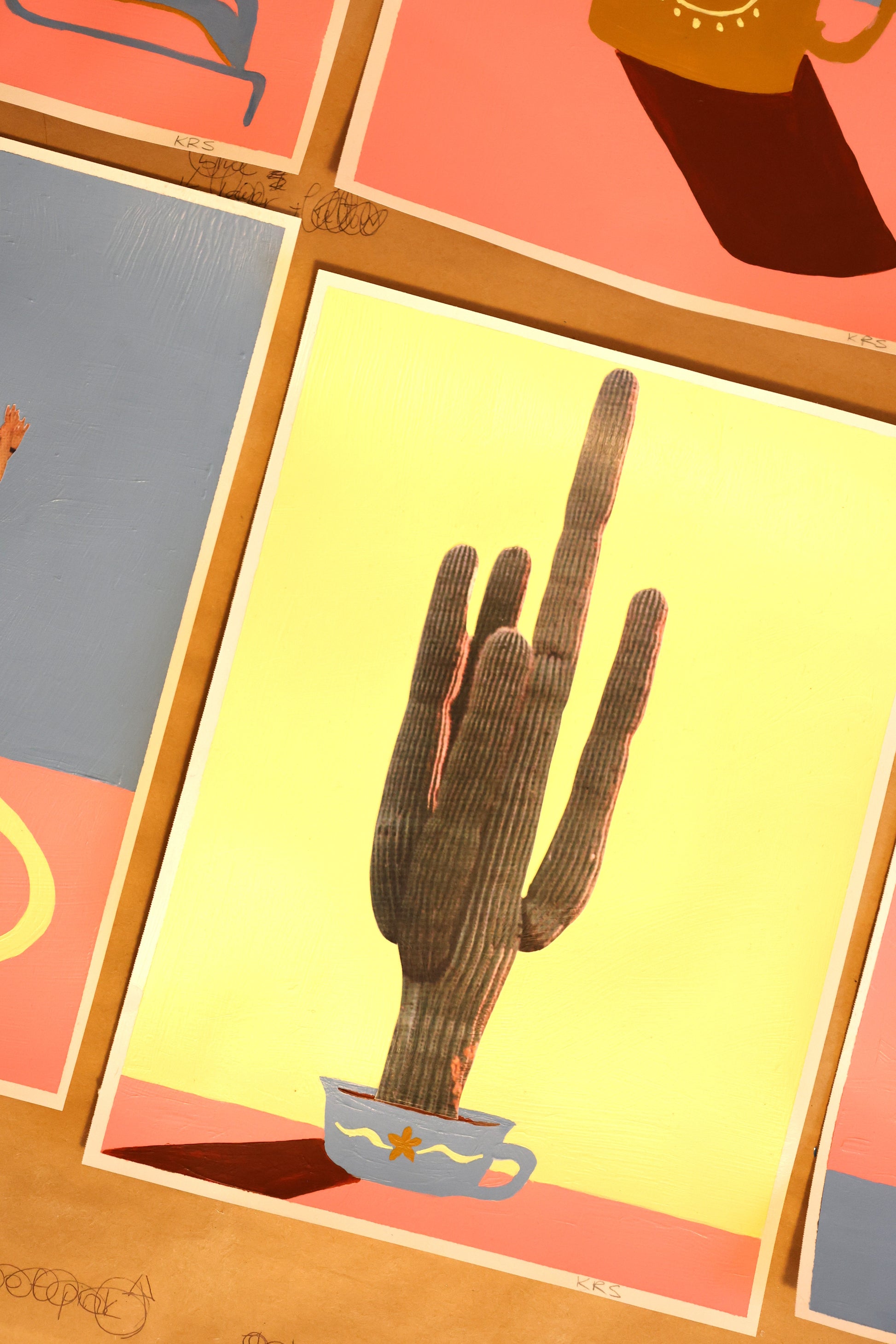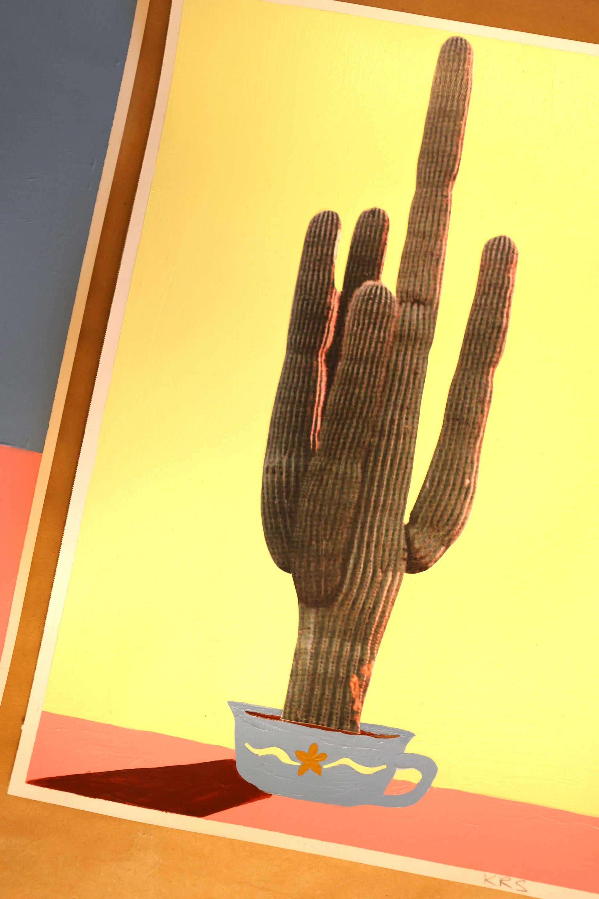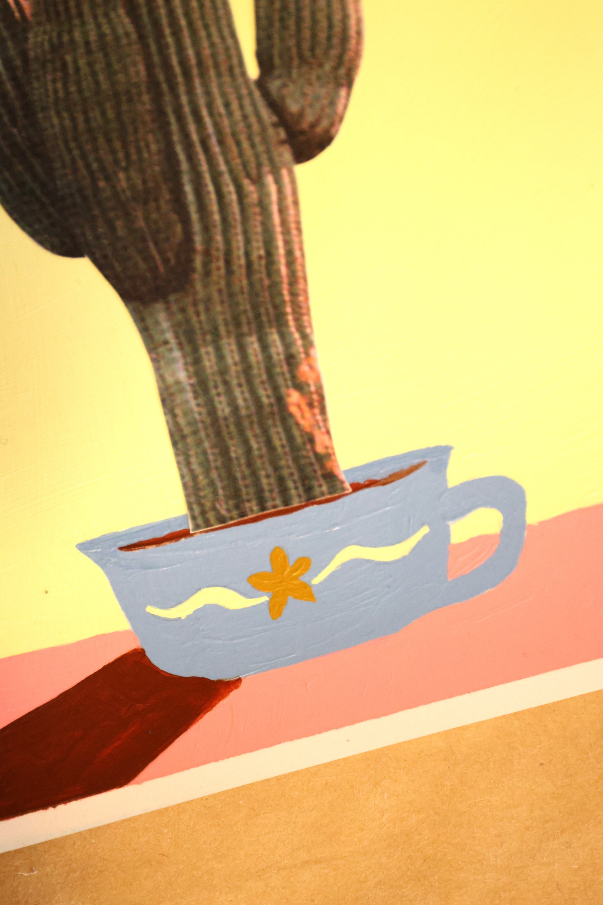 Petite blue teacup with ocher flower detail. A giant strong cacti is immersed with strength.