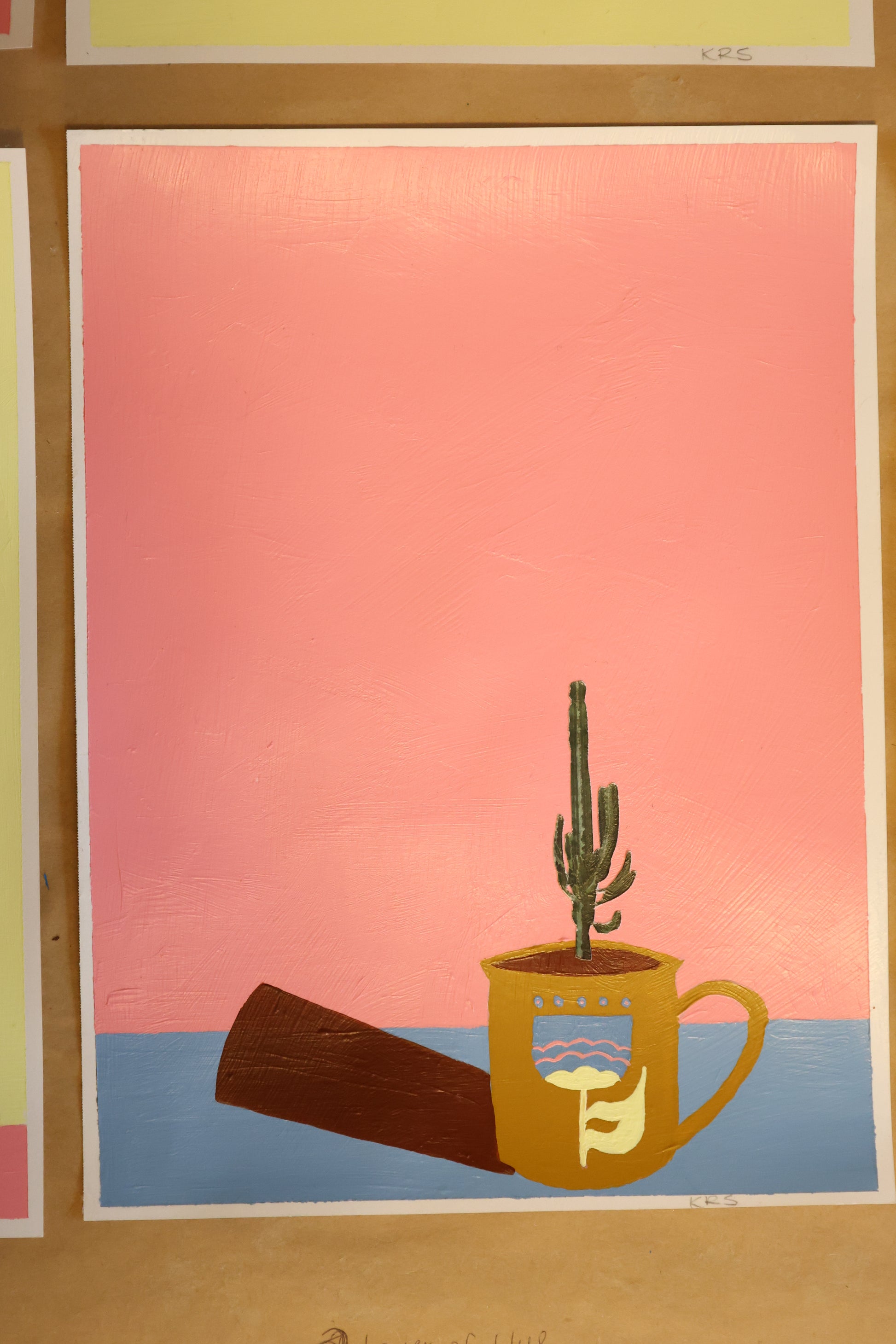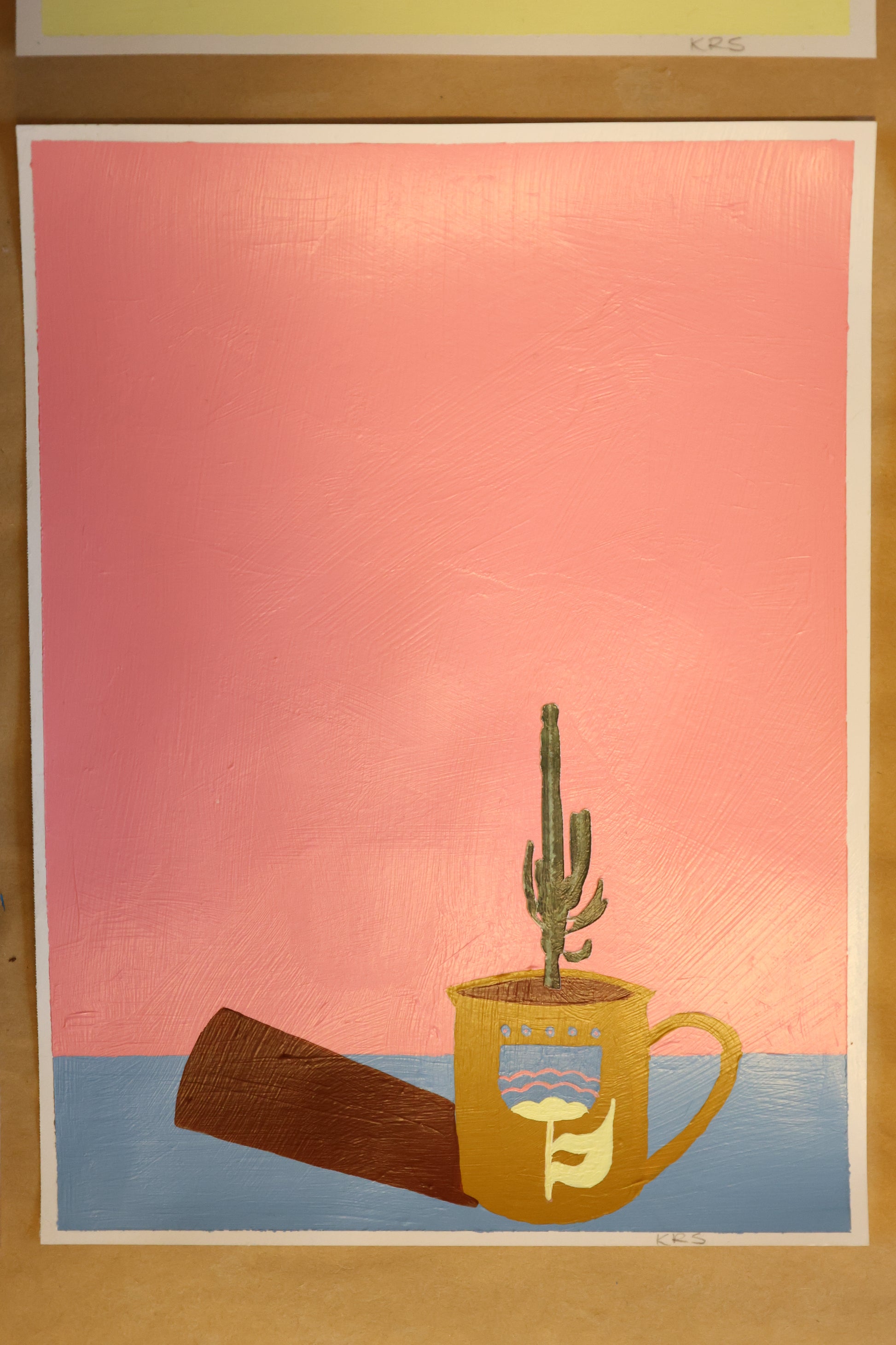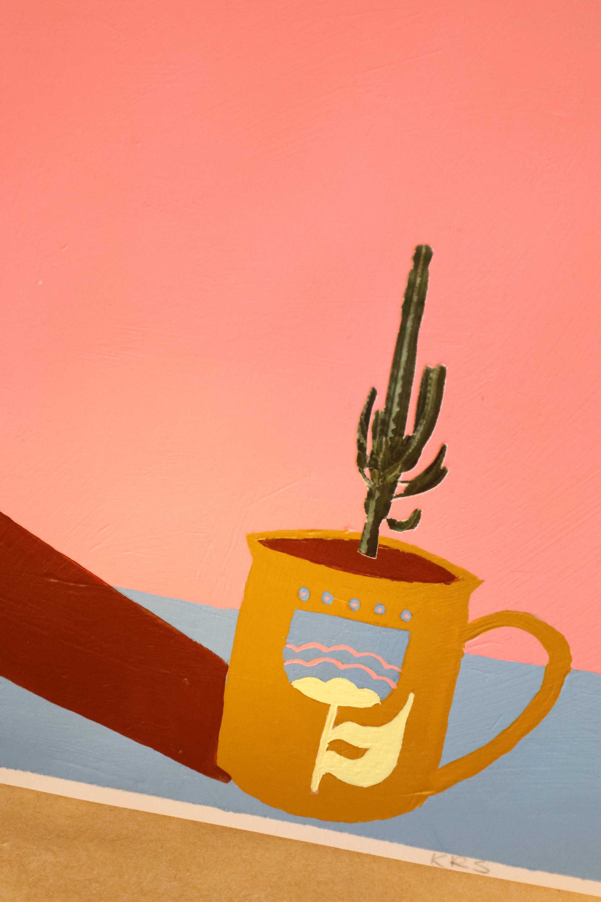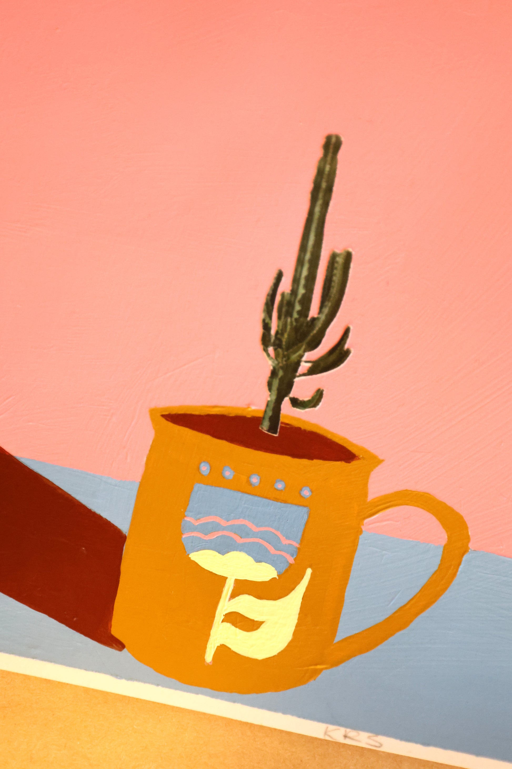 A small ocher espresso with a cacti that seemingly fits in stature. A pink background anchors this piece.