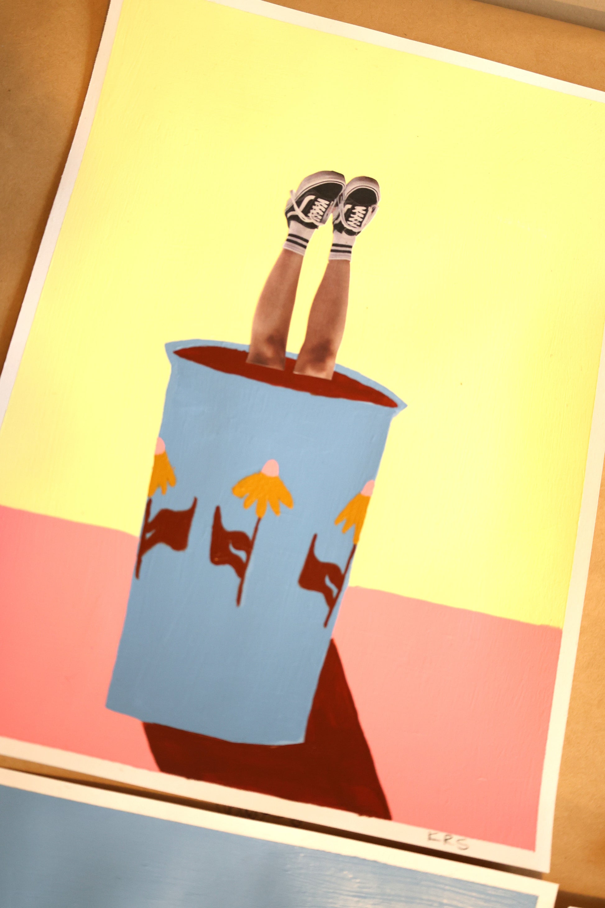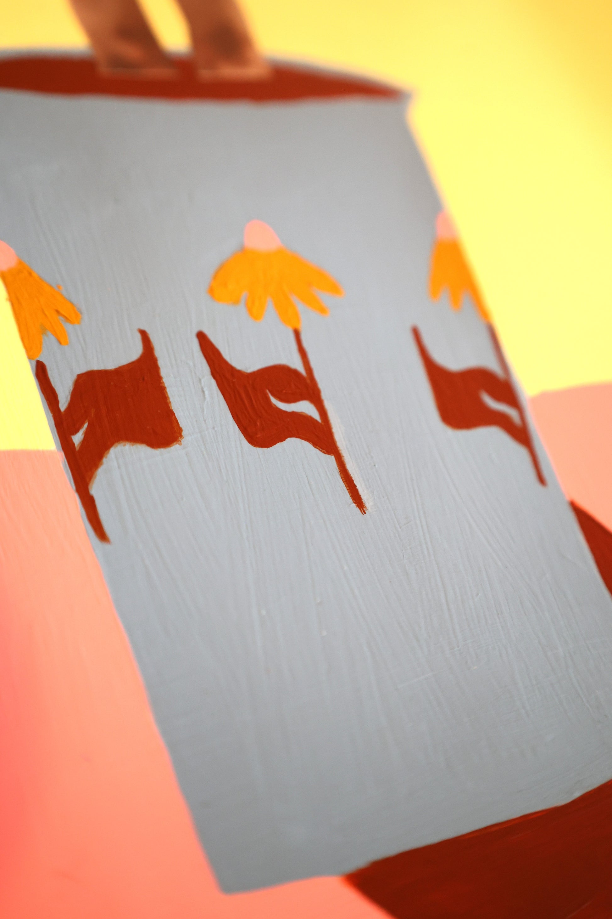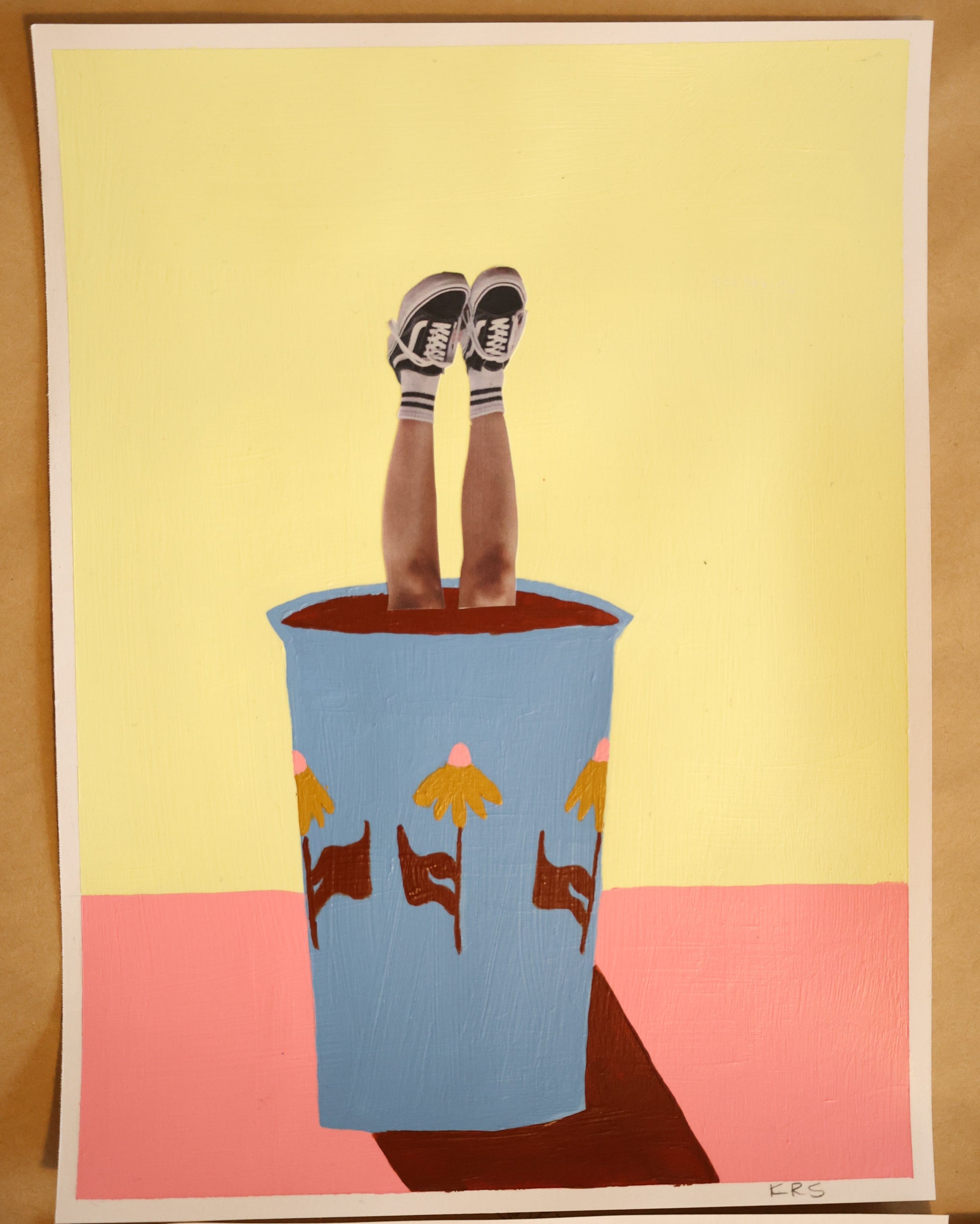 Tall mug of joe with relaxed folk art flowers gives life to a pair of legs with sneakers.